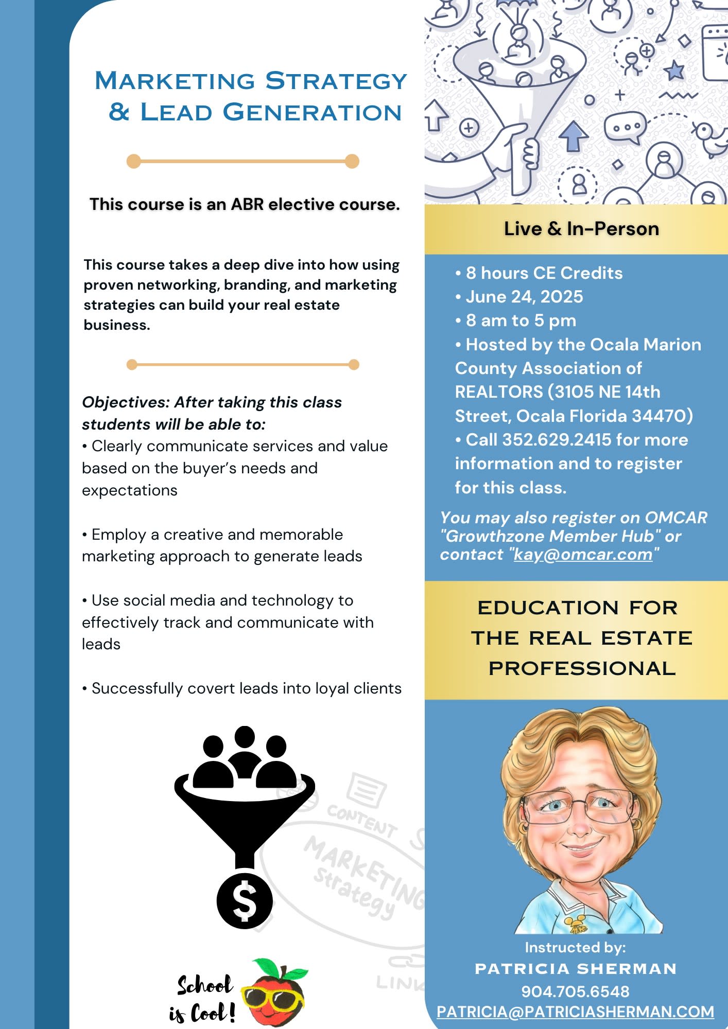 Summarize basic marketing principles and explain the importance of marketing for your real estate business. Describe the relationship between marketing and lead generation. Identify the framework for developing an effective marketing strategy. (ABR) Elective 8 CE Instructor Patricia Sherman
